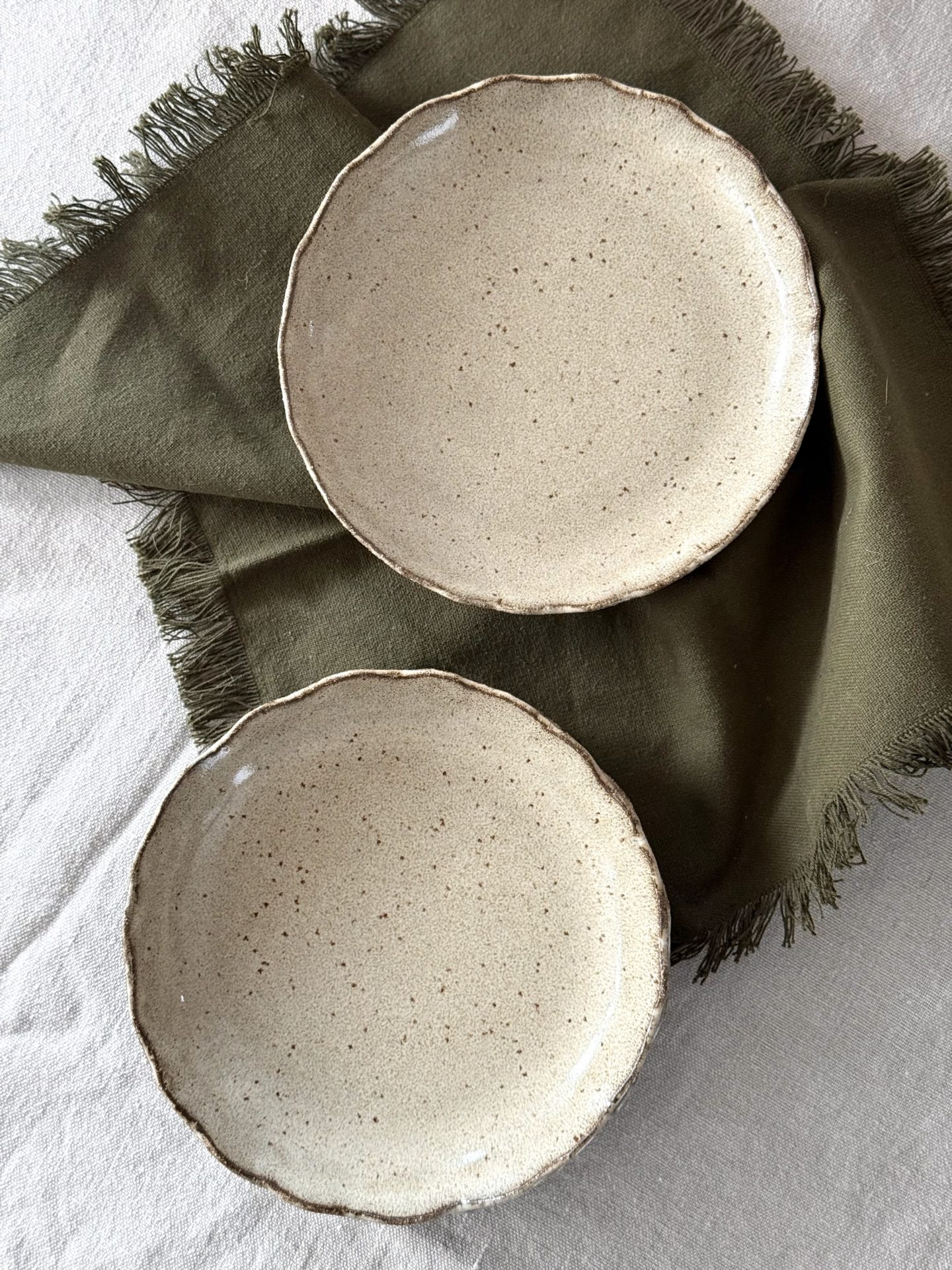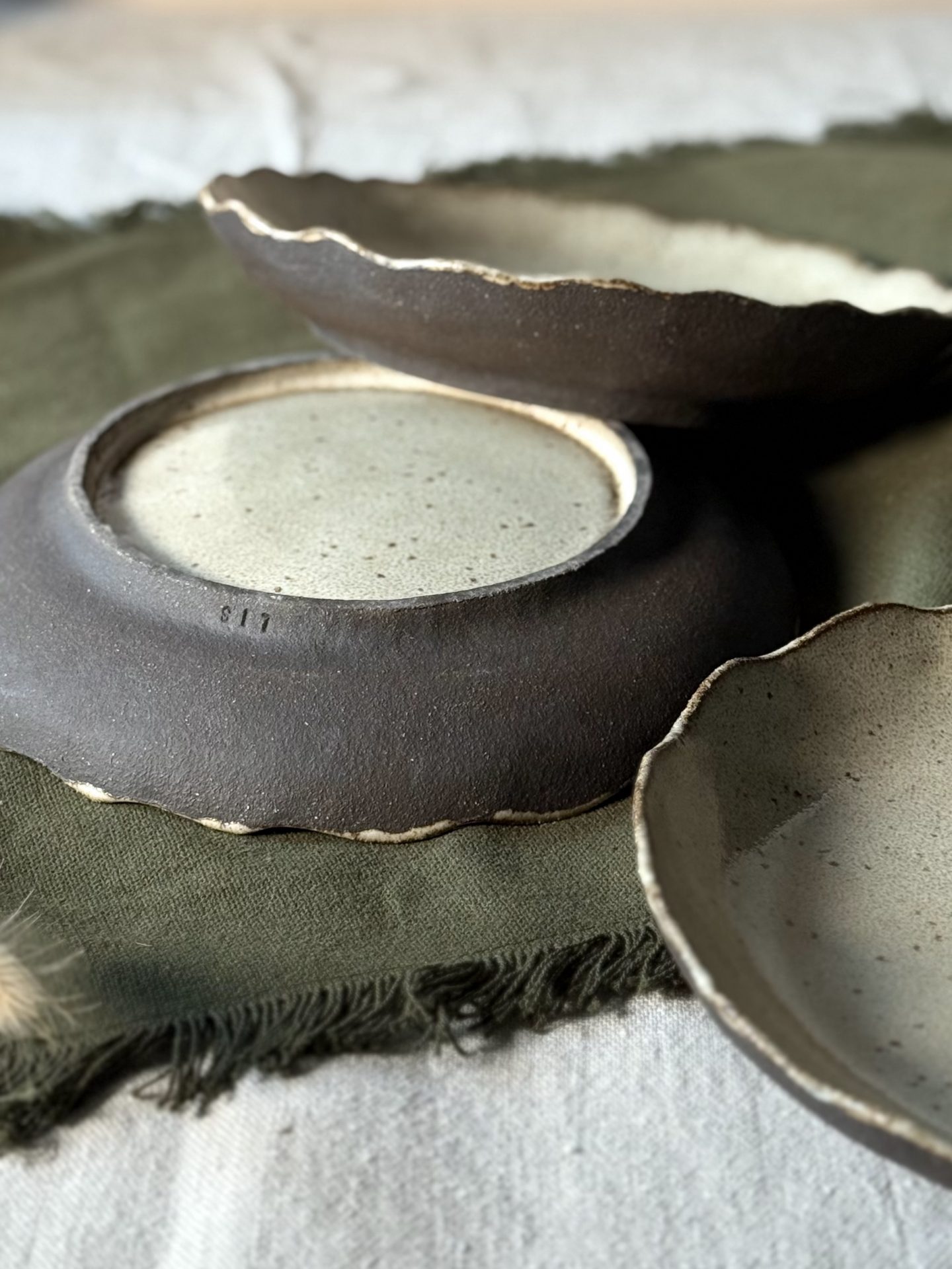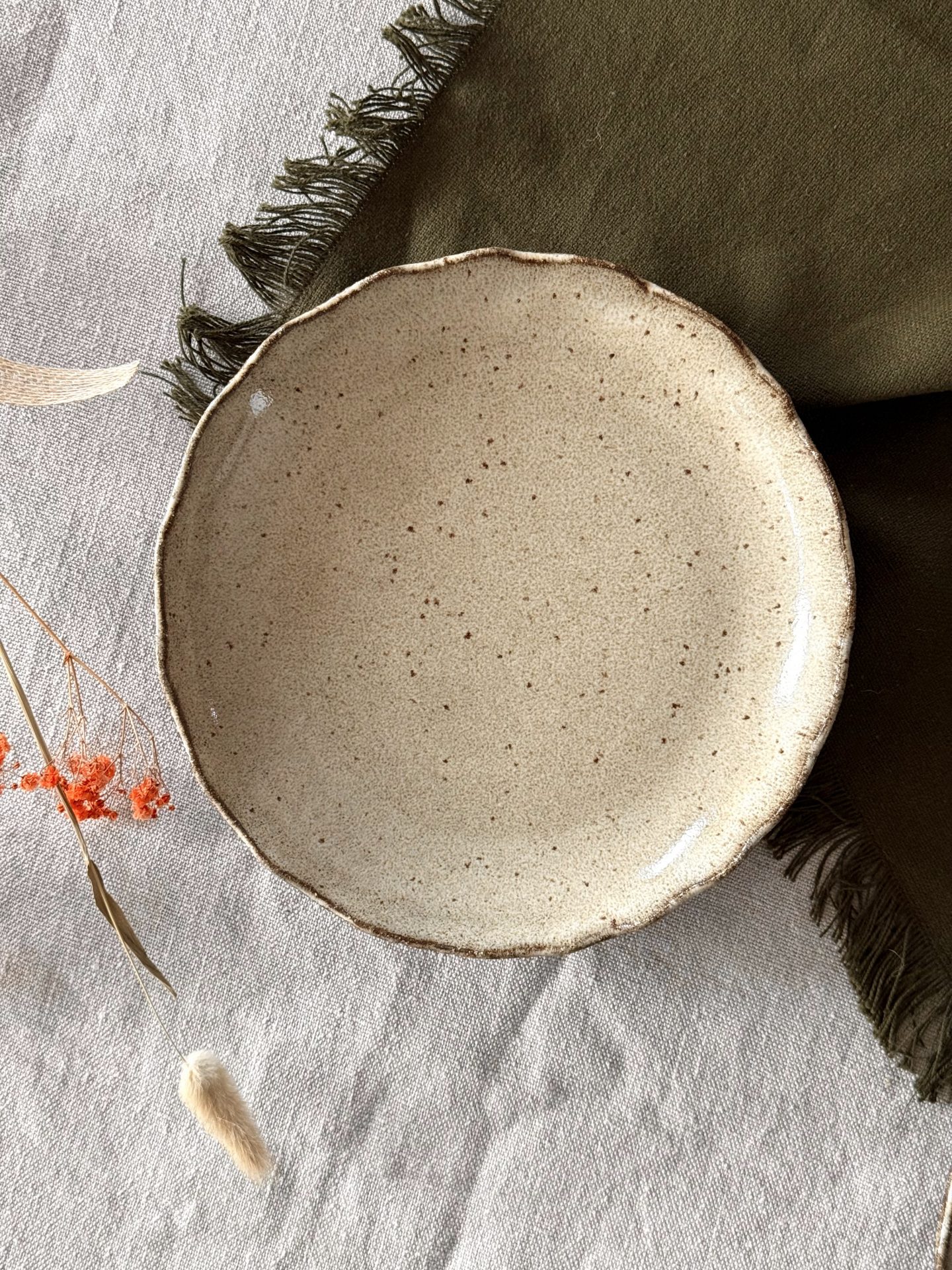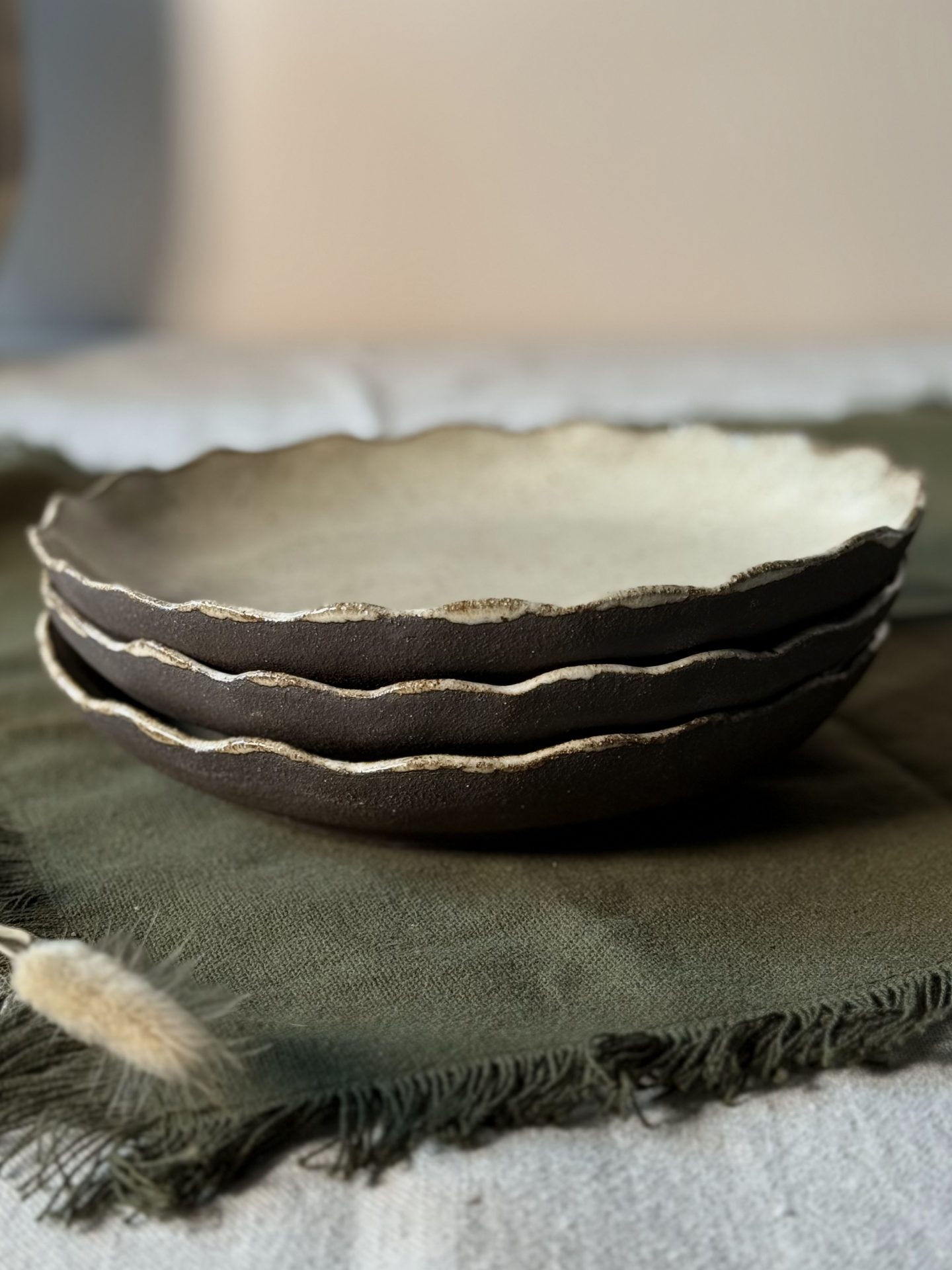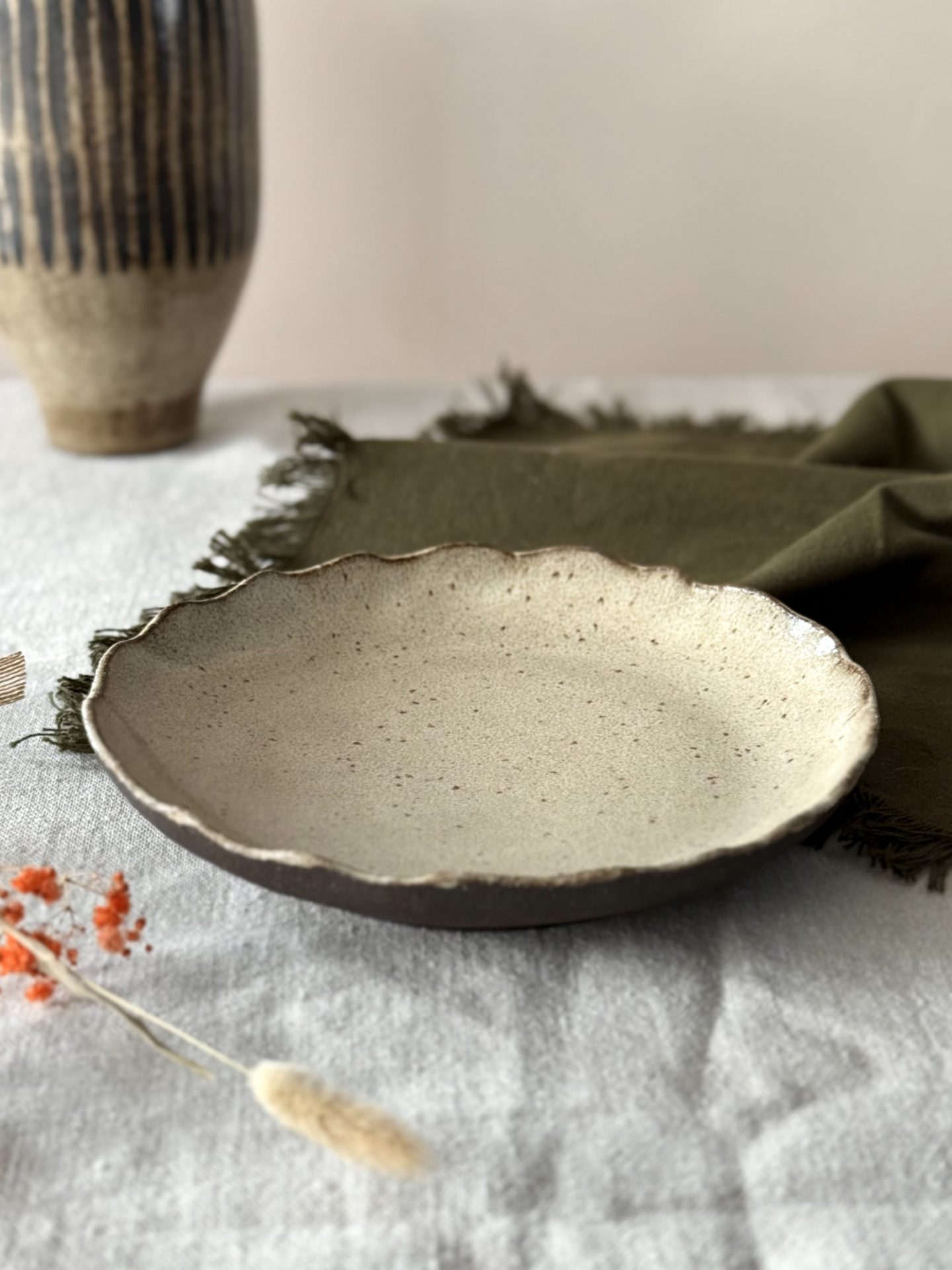 L’assiette JASMINA en céramique artisanale est façonné en grès noir chamotté, elle est recouverte d’un émail brillant crème pyrité. Elle possède un pied sculpté, et son dessous est également émaillé, ce qui facilite l’entretien et apporte un confort supplémentaire à l’usage. Adapté à un usage alimentaire.