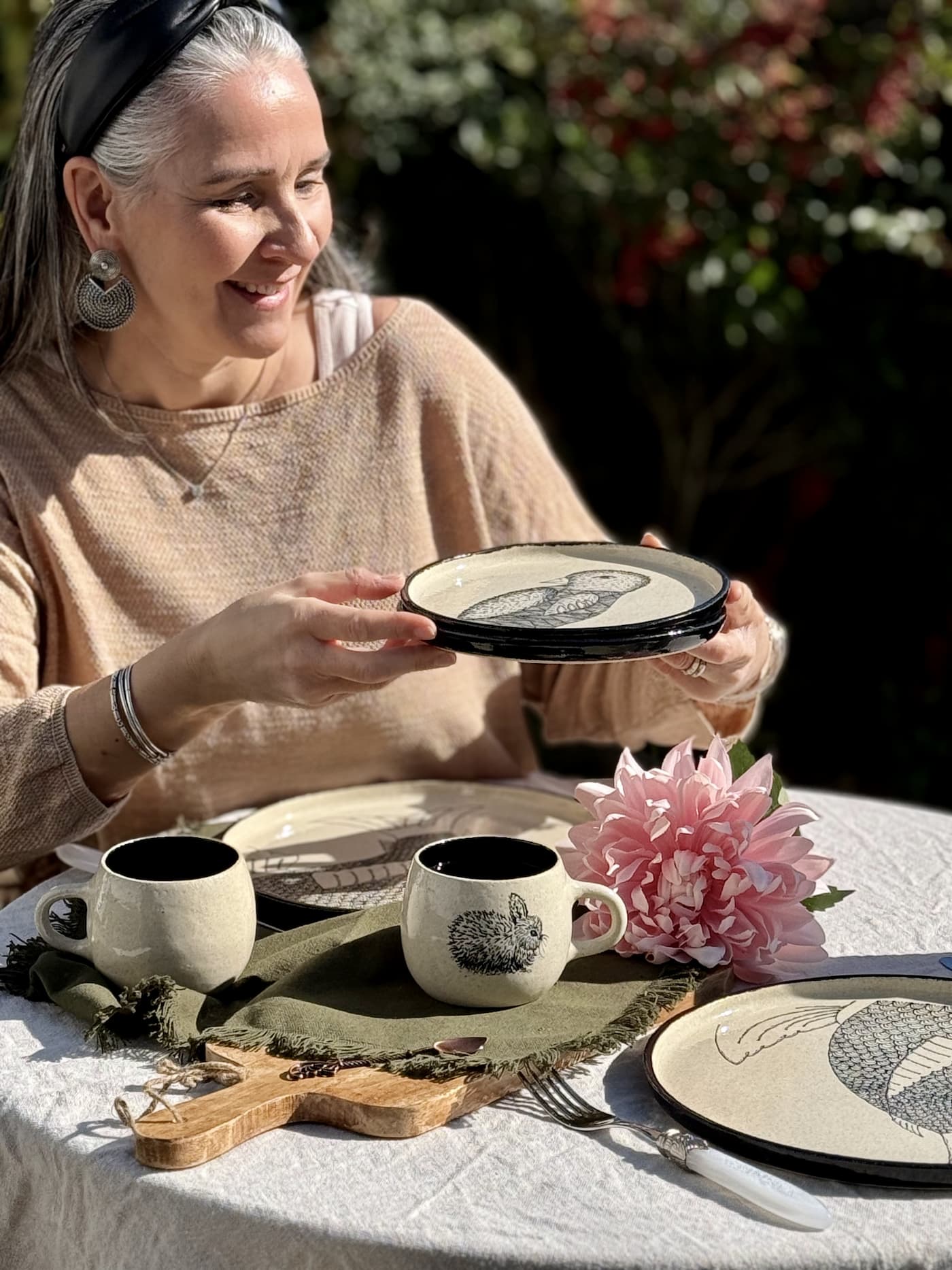 Chaque assiette est réalisée dans mon atelier en Haute-Savoie. De légères variations de forme, de taille ou de décor peuvent apparaître après cuisson : elles rendent chaque pièce unique.