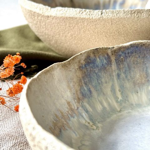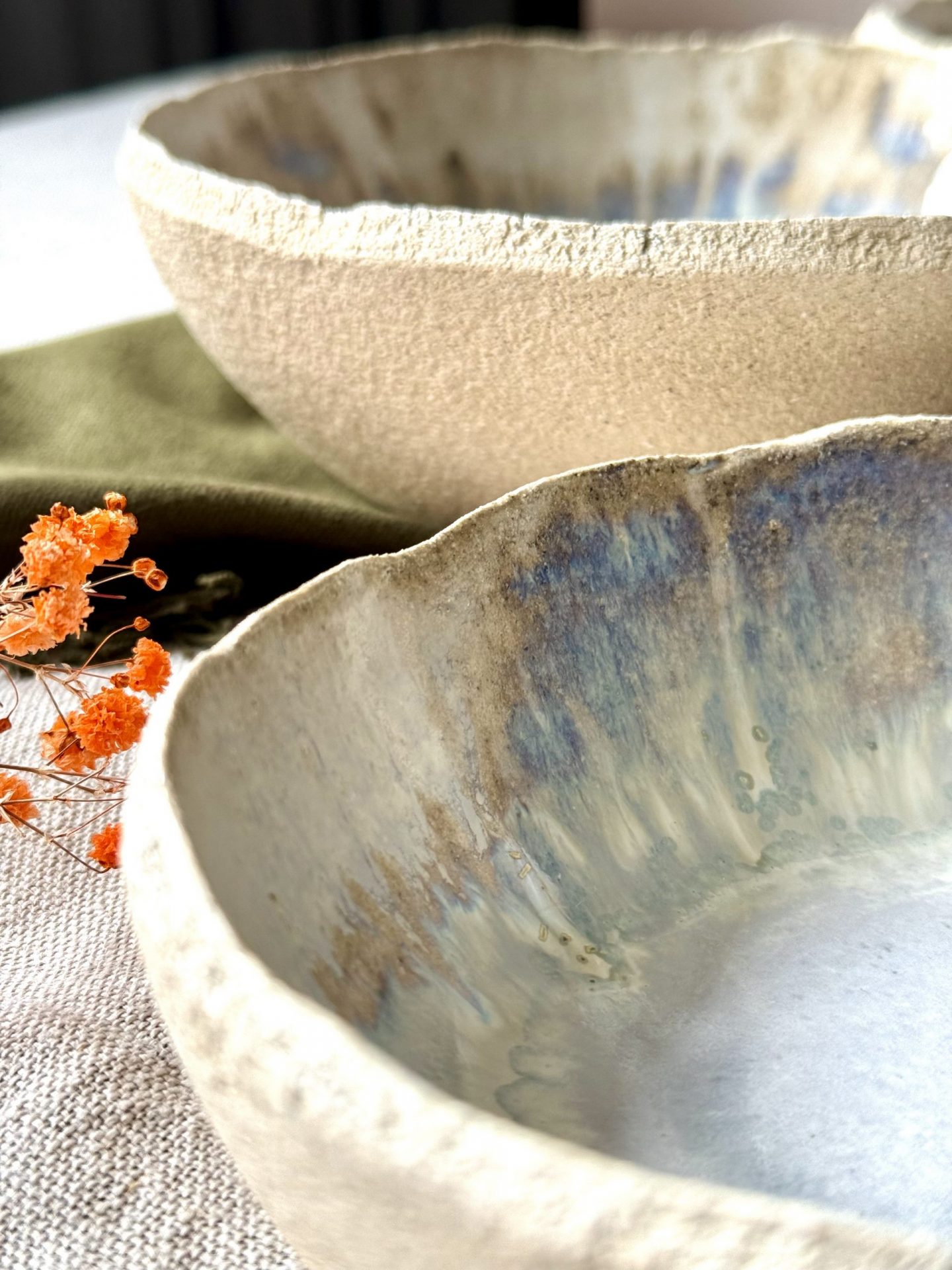 Le bol AURORA en céramique artisanale façonné à la main se distingue par sa forme ovale douce et son contraste entre chamotte brute et émail lumineux.