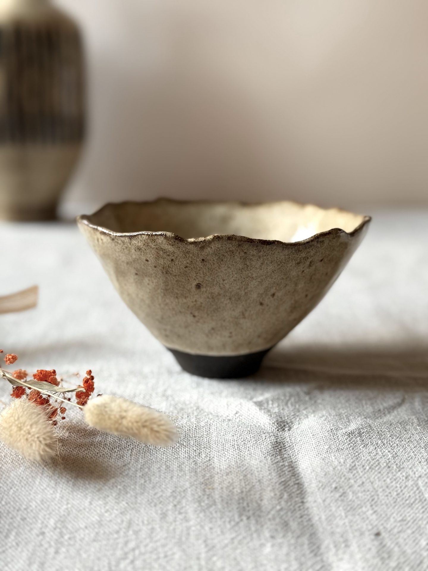 Le bol CAMELLIA en céramique artisanale est façonné en grès noir chamotté, il est recouvert d’un émail brillant crème pyrité. Il possède un pied sculpté, et son dessous est également émaillé, ce qui facilite l’entretien et apporte un confort supplémentaire à l’usage. Adapté à un usage alimentaire.