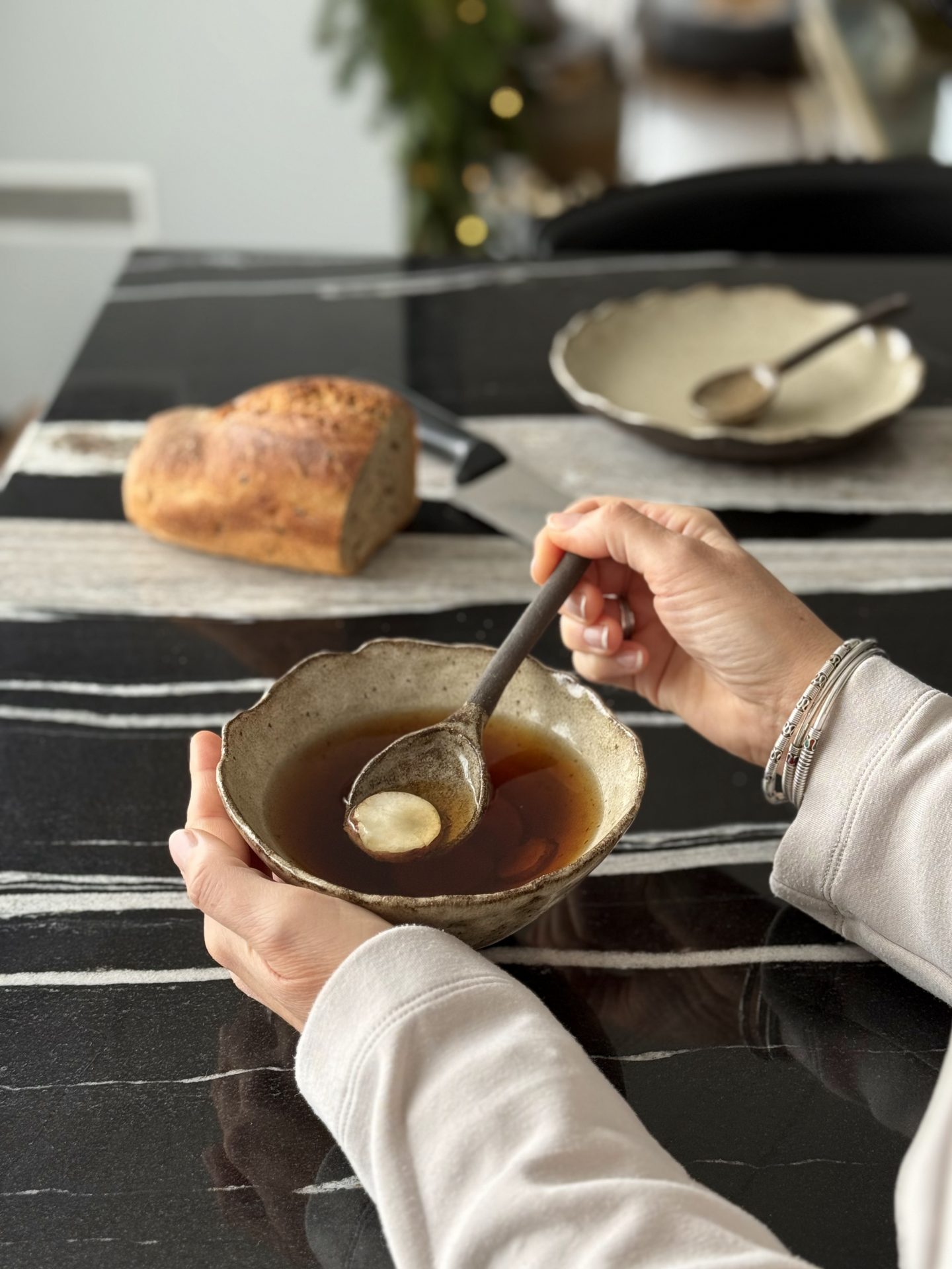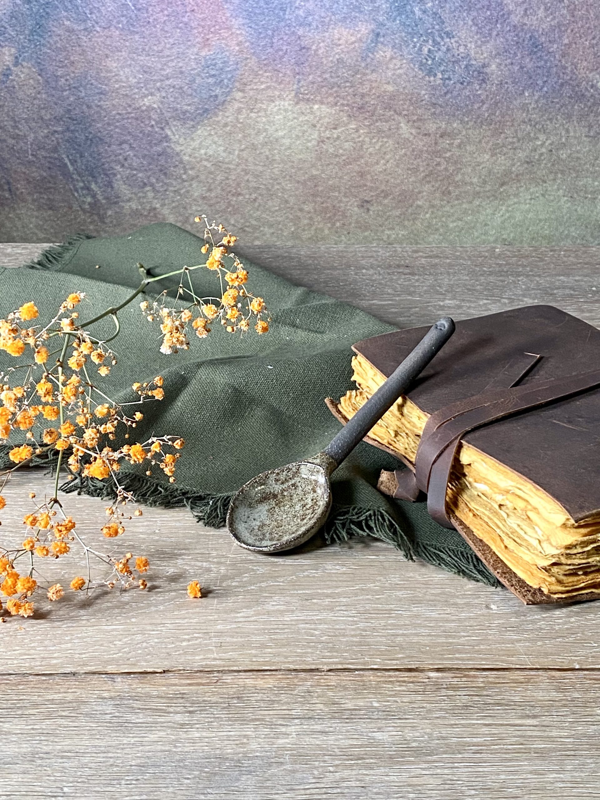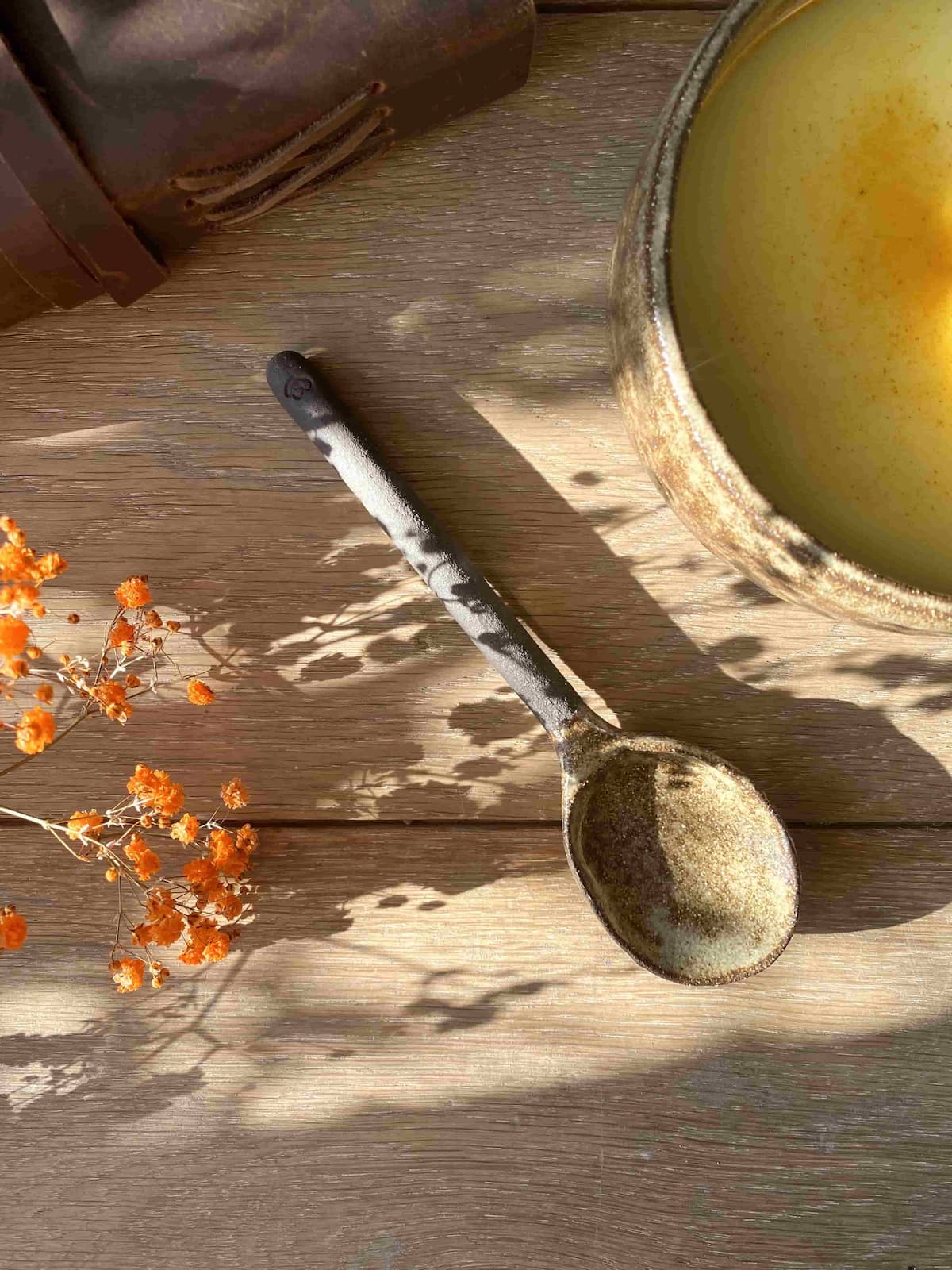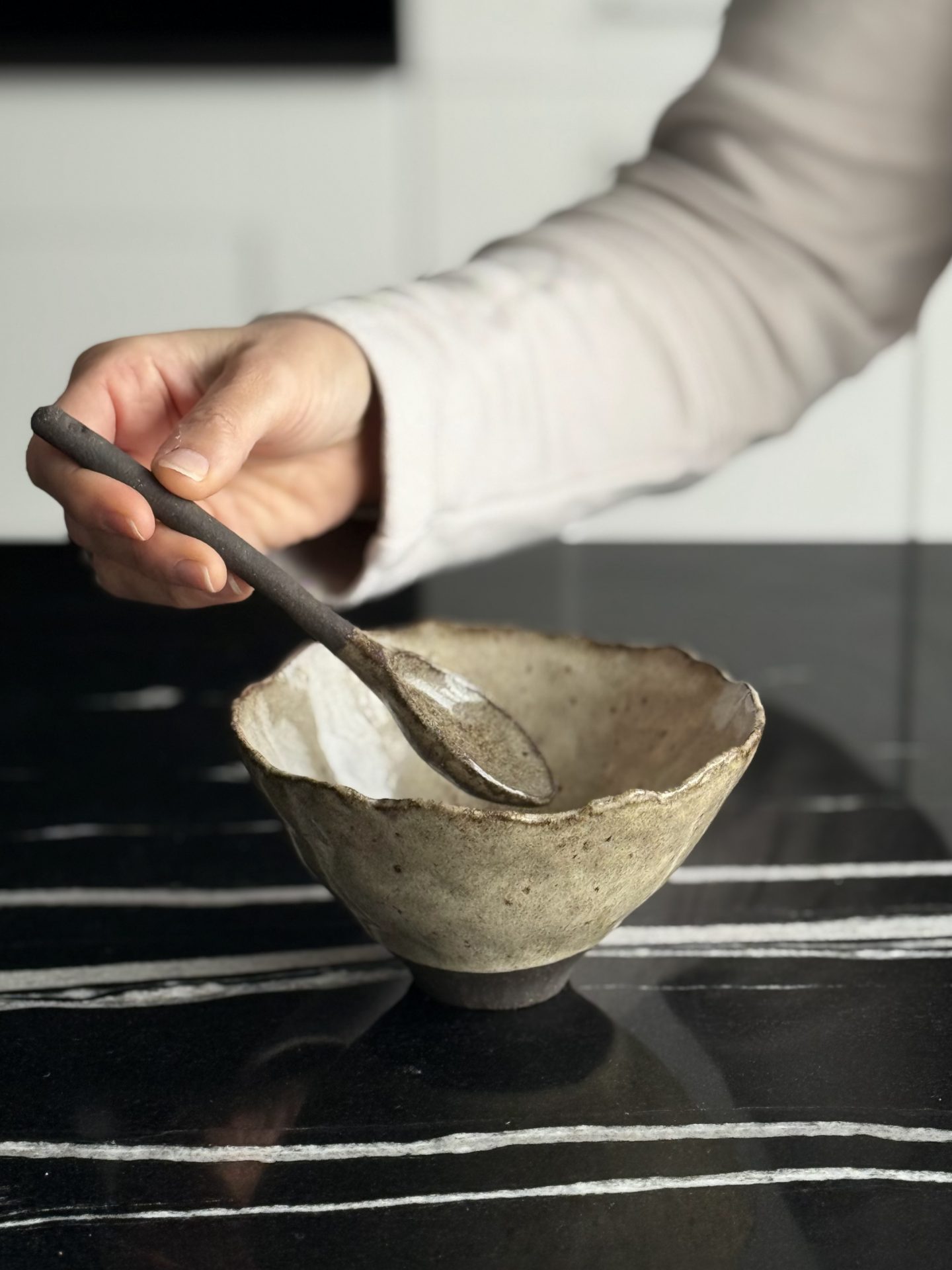 La cuillère BINTOU en céramique artisanale est façonnée à la main en grès noir chamotté, recouvert d’un émail brillant crème pyrité. Matières premières naturelles, sans additif toxique. Convient à un usage alimentaire.