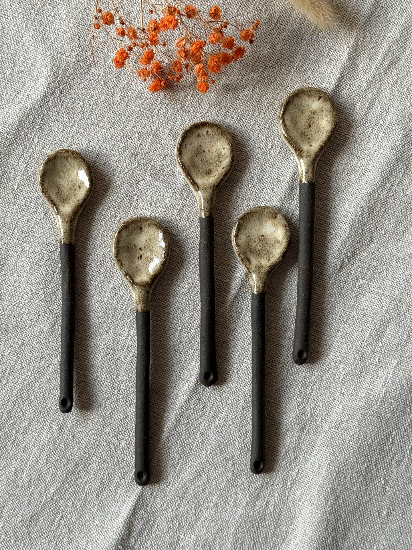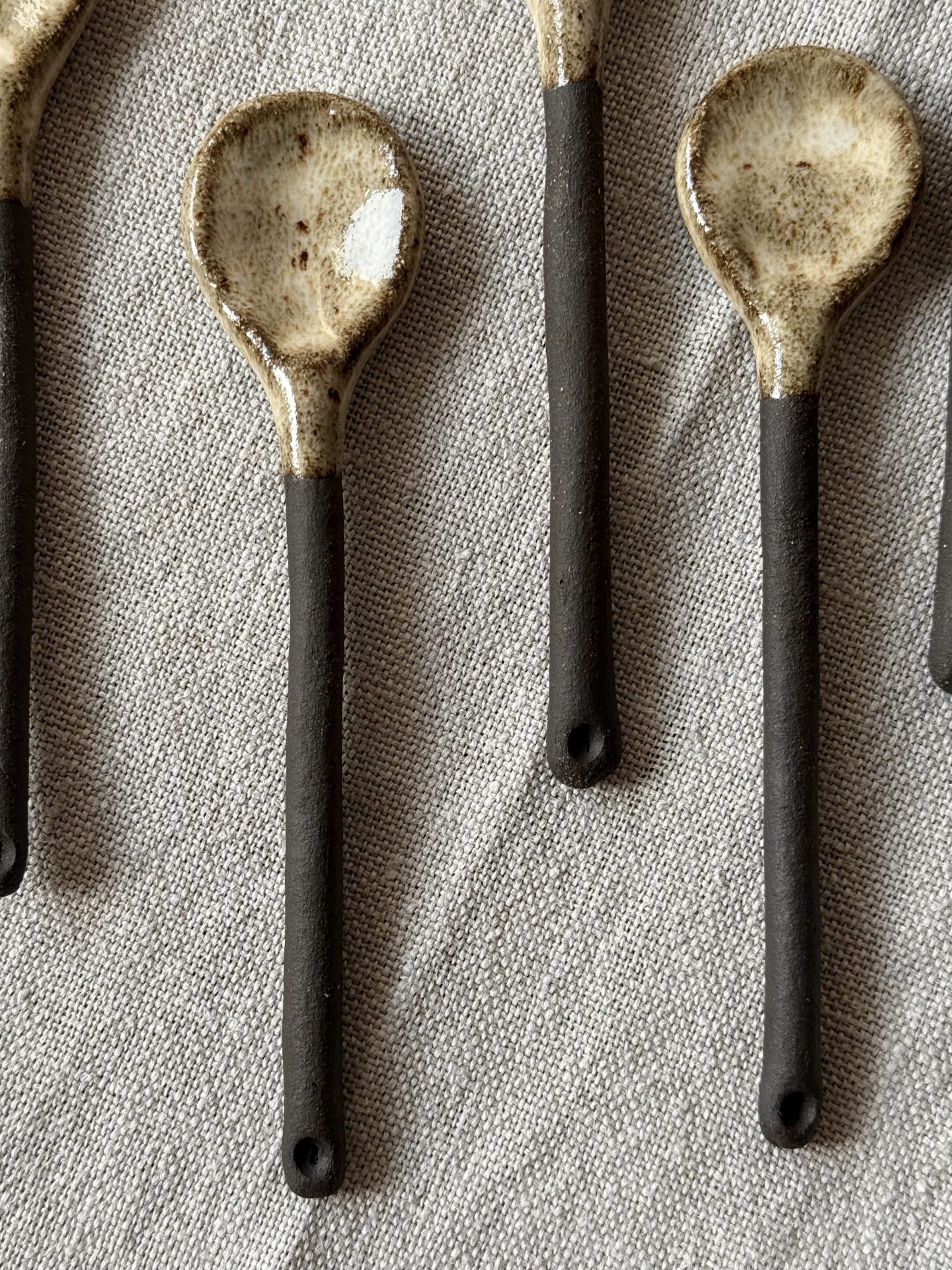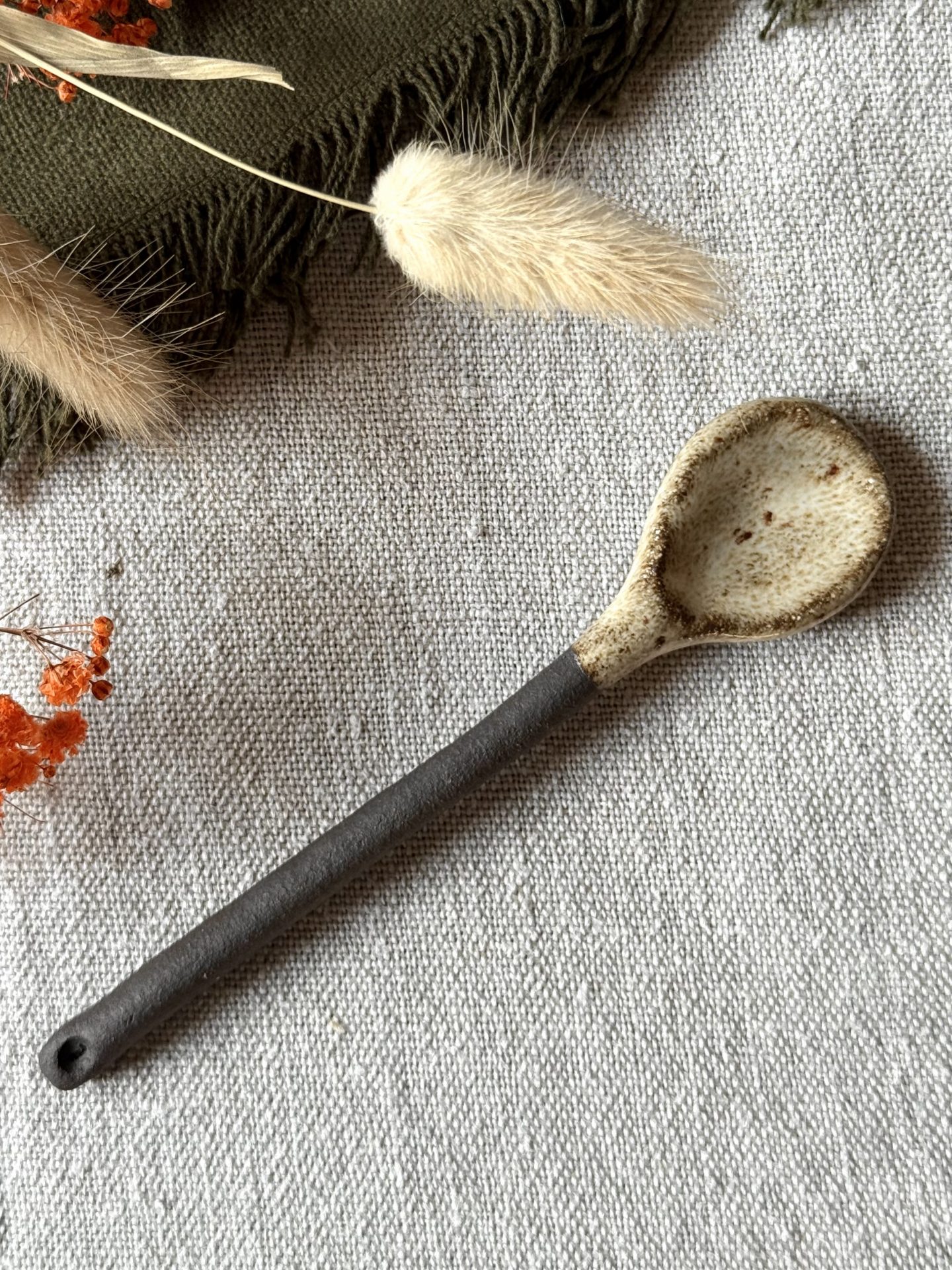 La cuillère ROSA en céramique artisanale est façonnée en grès noir chamotté, elle est recouverte d’un émail brillant crème pyrité. Adapté à un usage alimentaire.