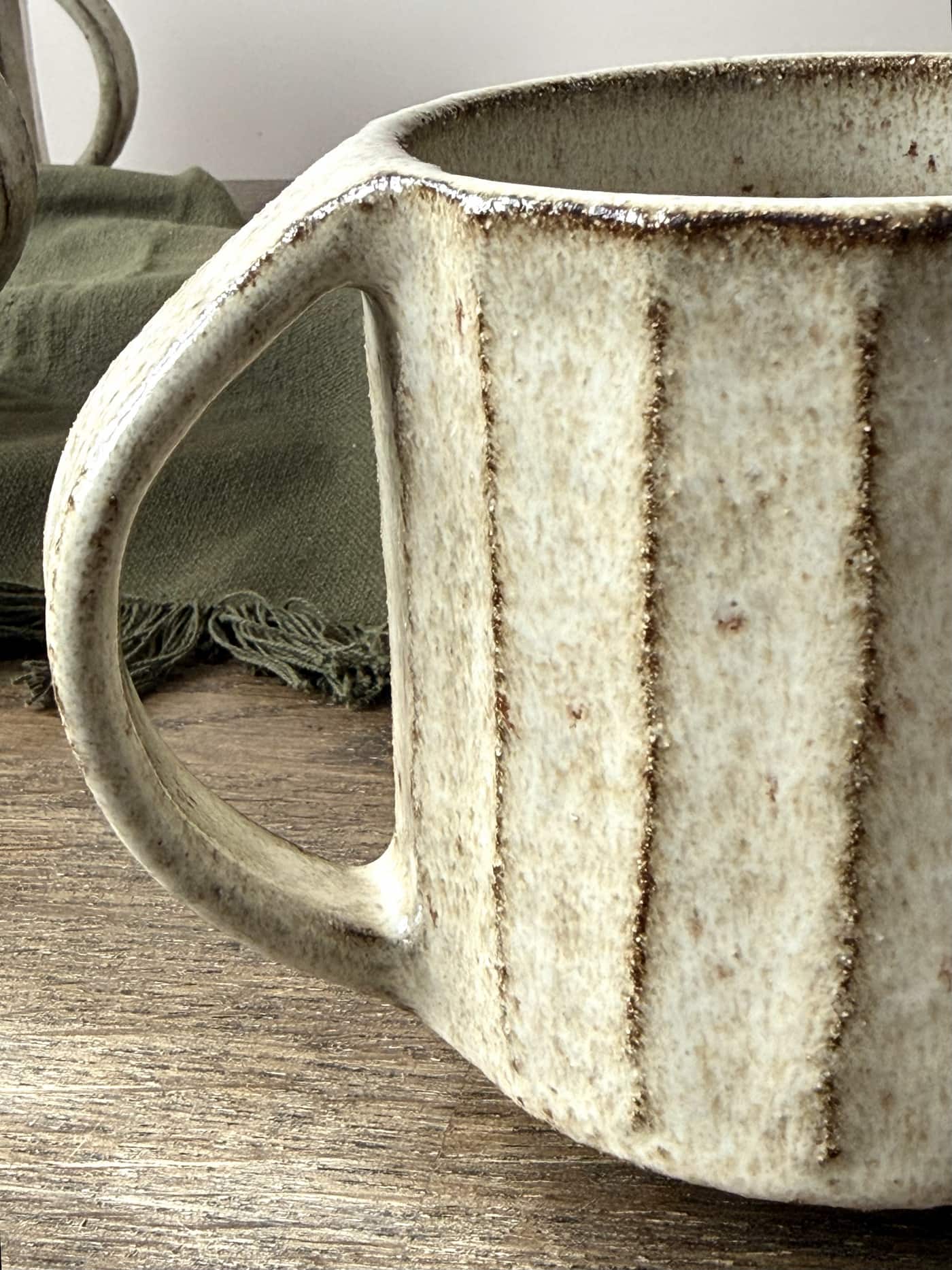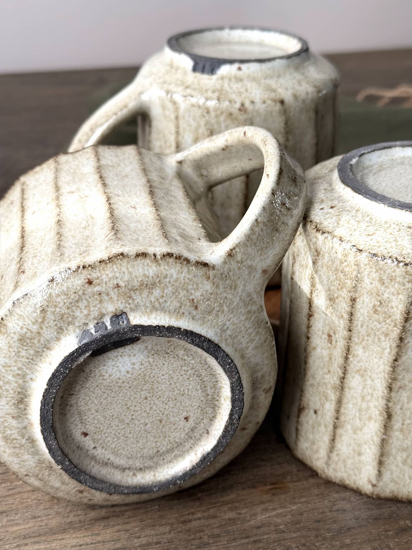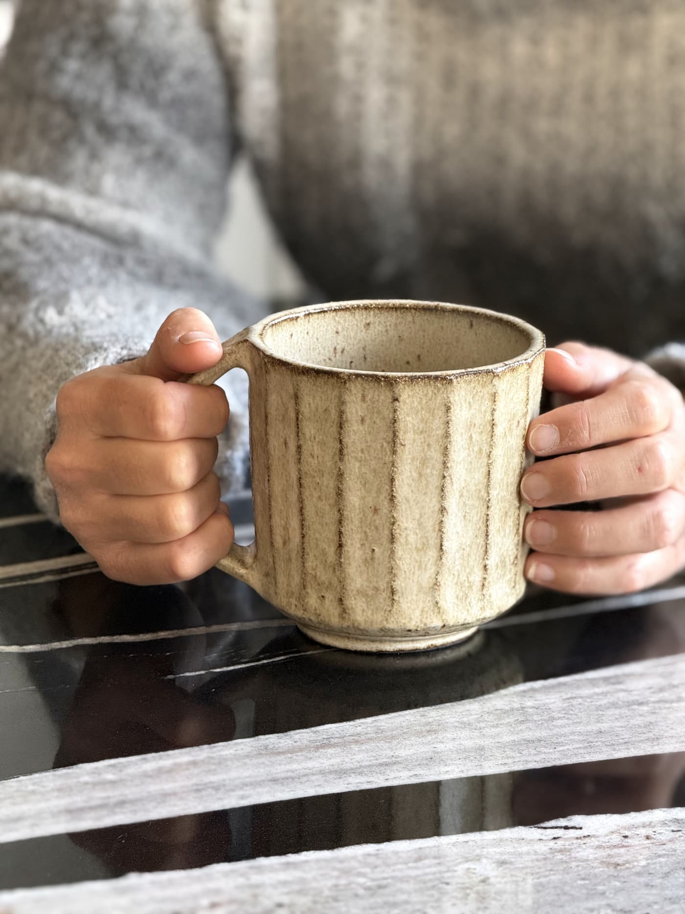 Je façonne le grand mug KAITO entièrement à la main dans mon atelier. Il est réalisé en grès noir chamotté, puis recouvert d’un émail brillant crème pyrité. Cet émail lumineux révèle des nuances douces et met en valeur la texture brute de la terre.
