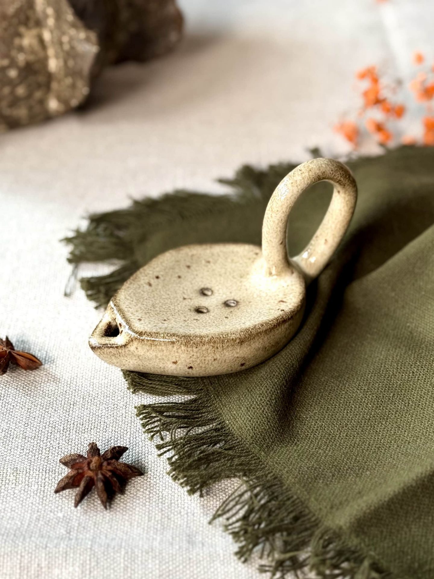 Lampe à huile STELLA façonnée à la main en grès noir chamotté, émaillée d’un crème brillant pyrité.