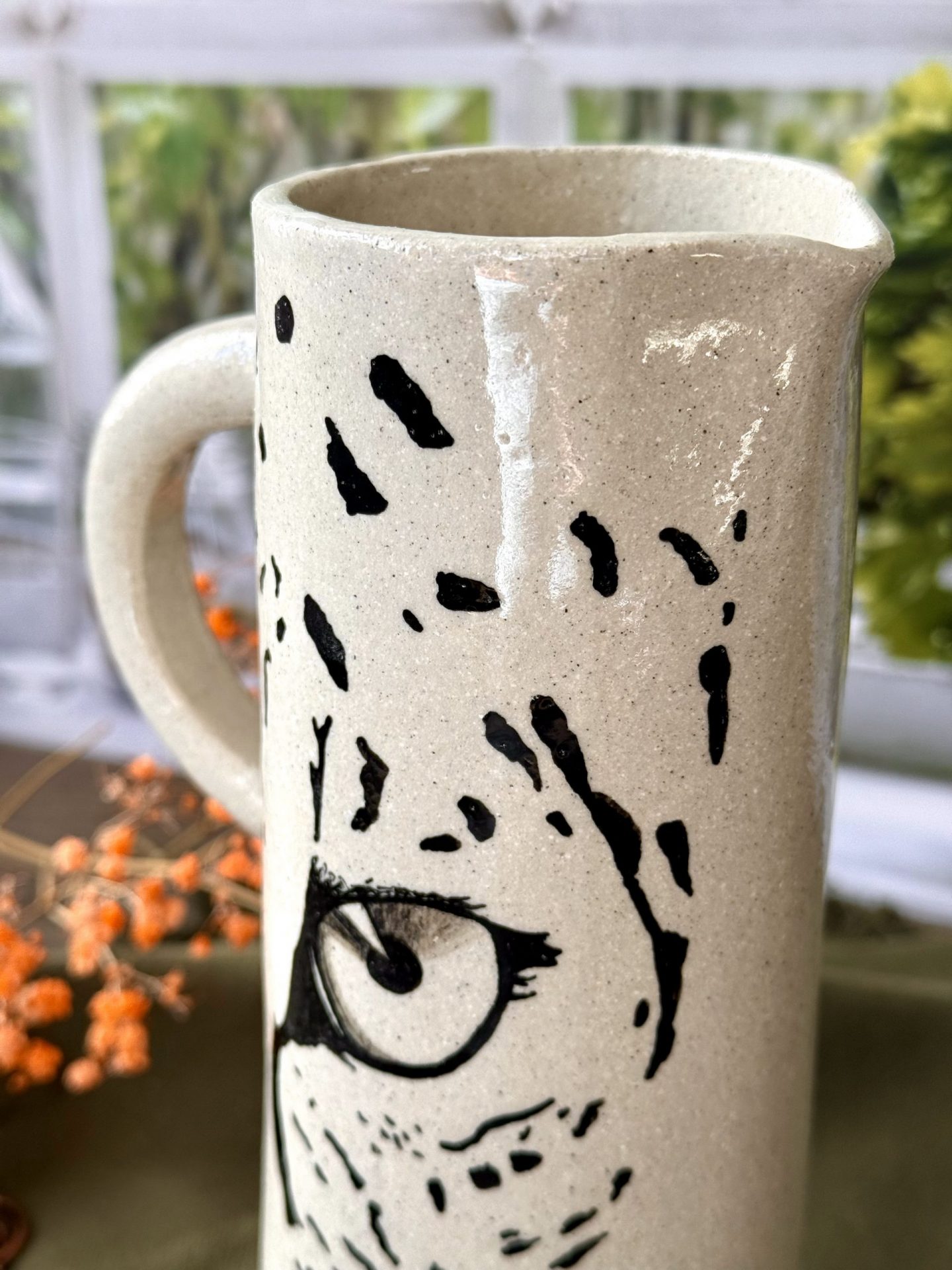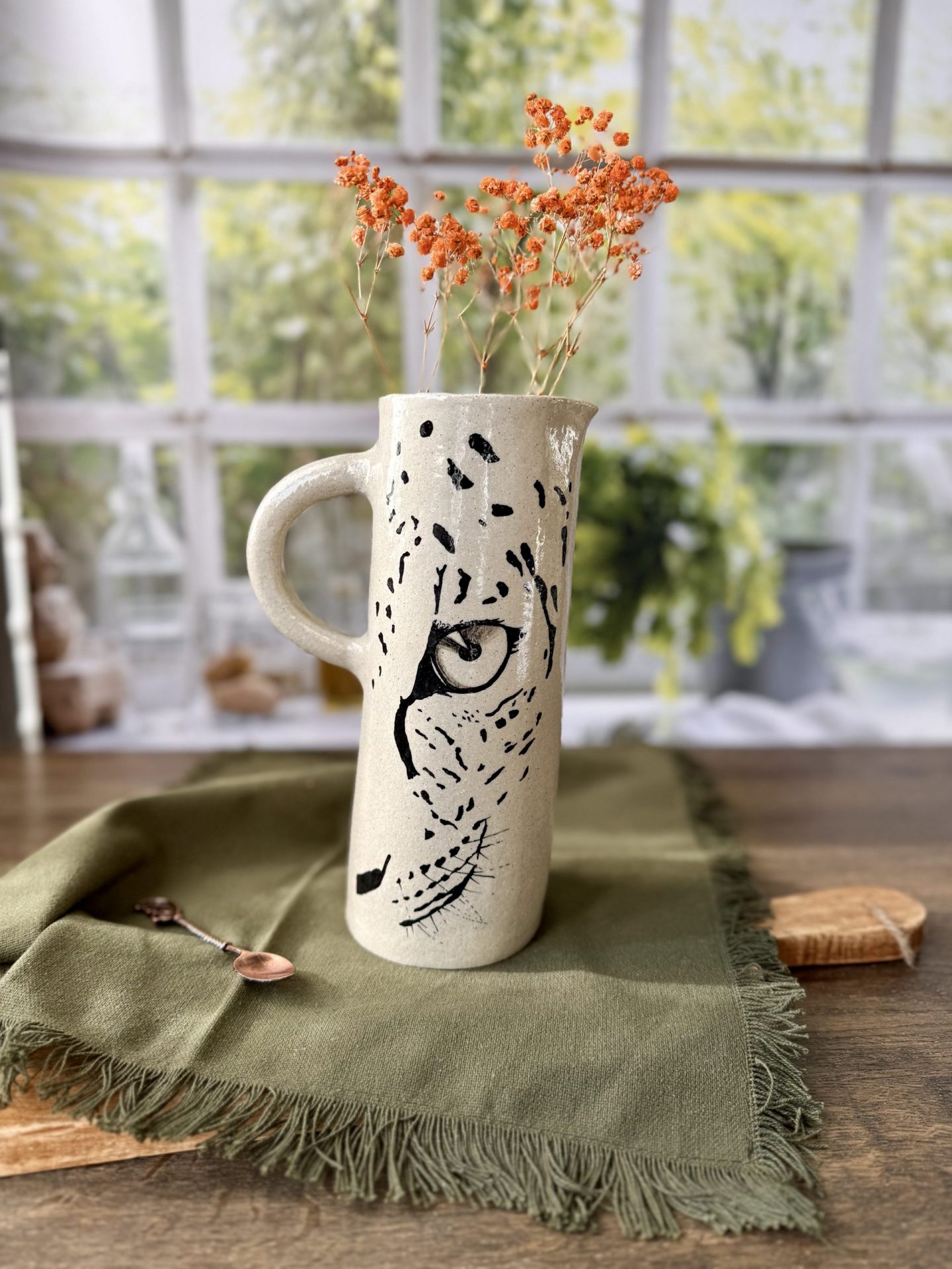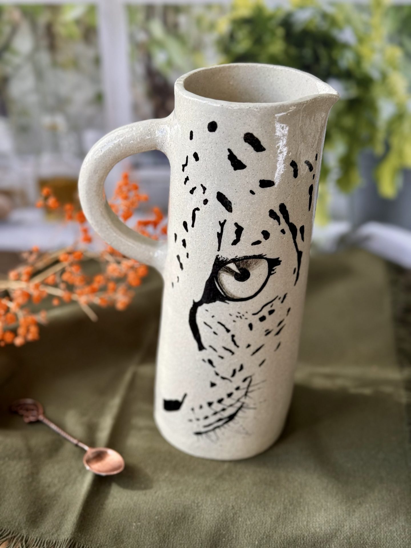 Le pichet GUÉPARD en céramique artisanale est façonné en grès blanc chamotté, recouvert d’un émail transparent brillant. Matières premières naturelles, sans additifs toxiques, adaptées à un usage alimentaire.