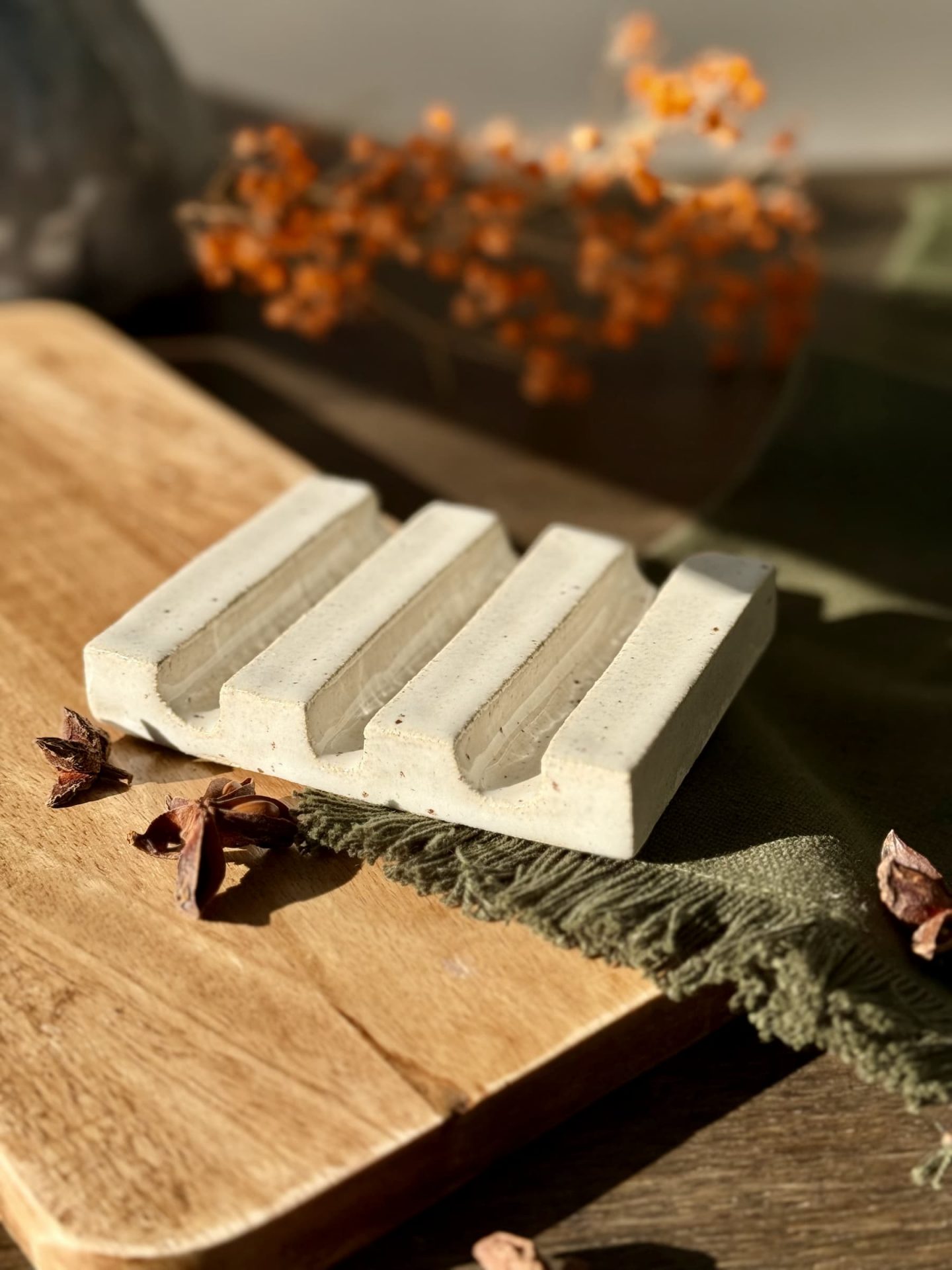 Grâce à ses rainures discrètes, l’eau s’évacue facilement. Ainsi, le savon sèche plus rapidement et ne reste pas constamment humide. ALIX prolonge donc la durée de vie de ton savon tout en structurant joliment l’espace autour du lavabo.