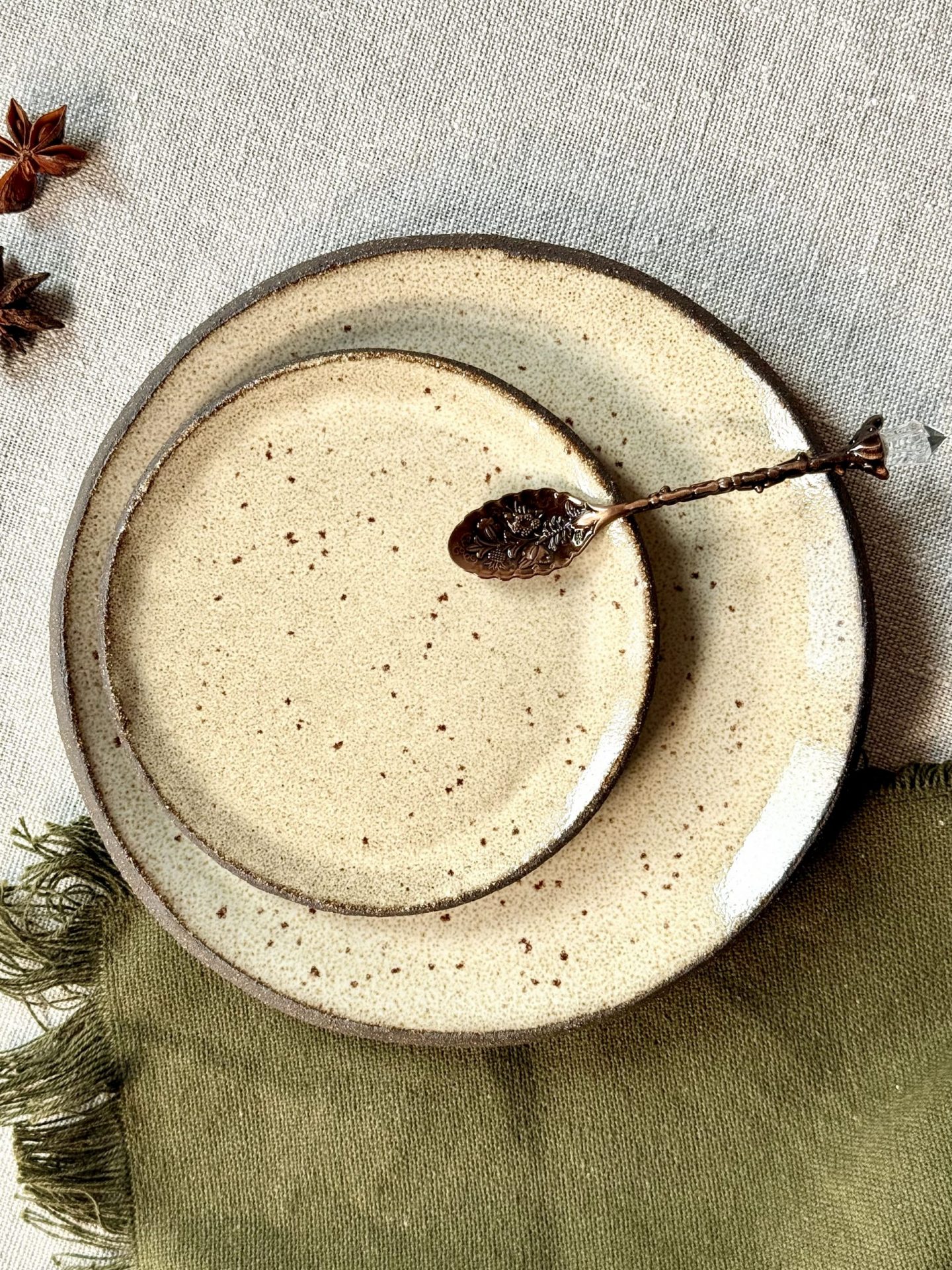 La sous-tasse ASMA en céramique artisanale est façonnée à la main en grès noir chamotté, recouvert d’un émail brillant crème pyrité. Matières premières naturelles, sans additif toxique. Convient à un usage alimentaire.