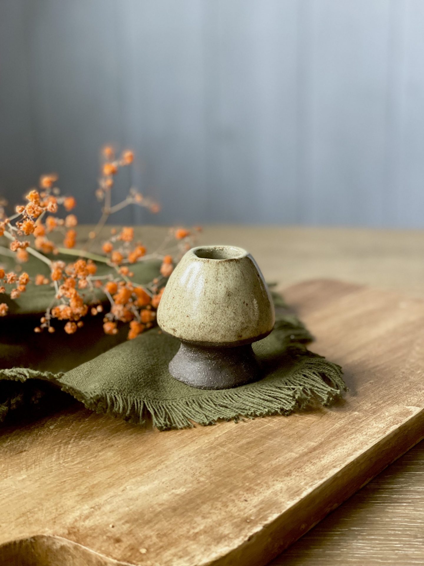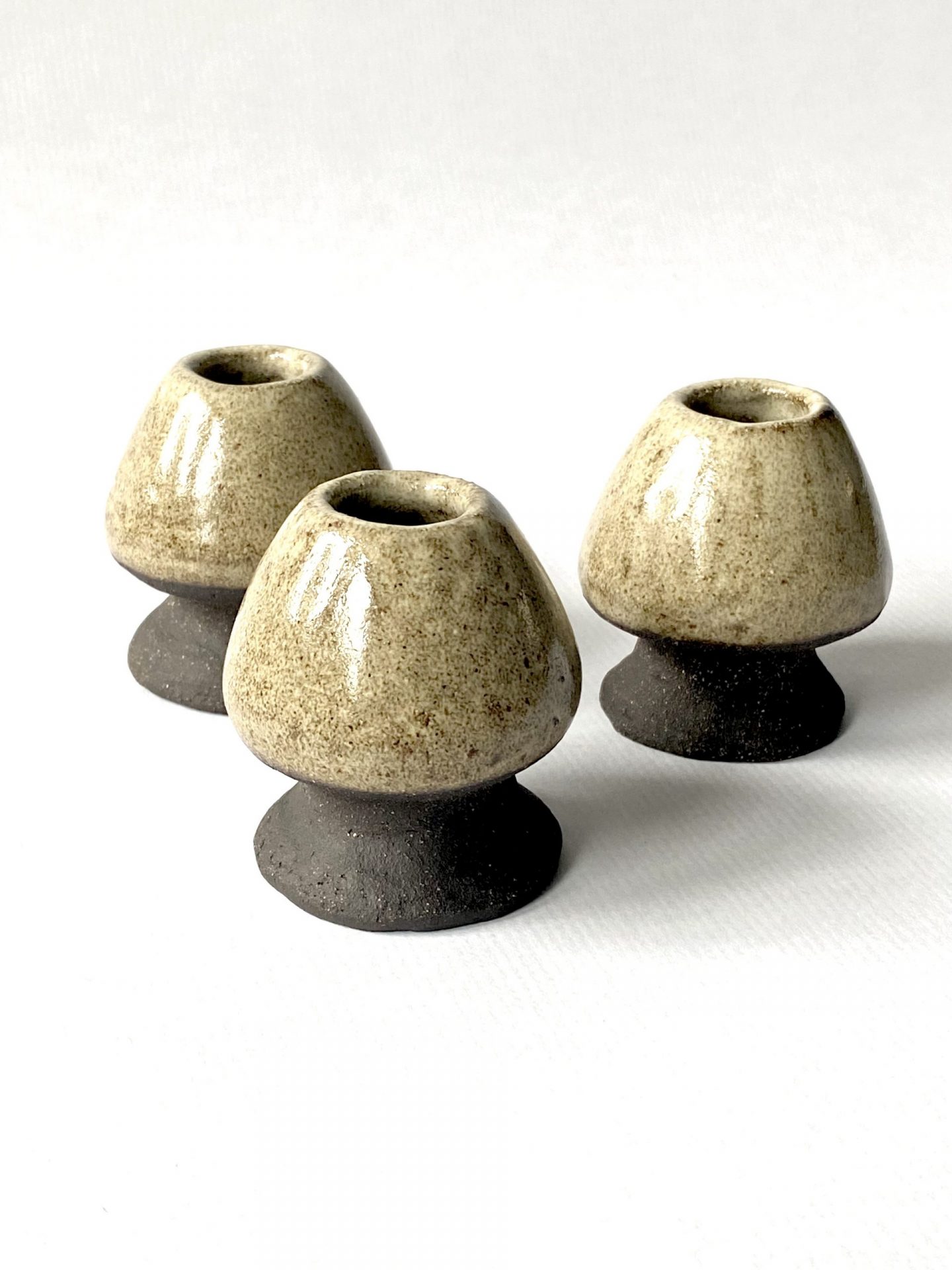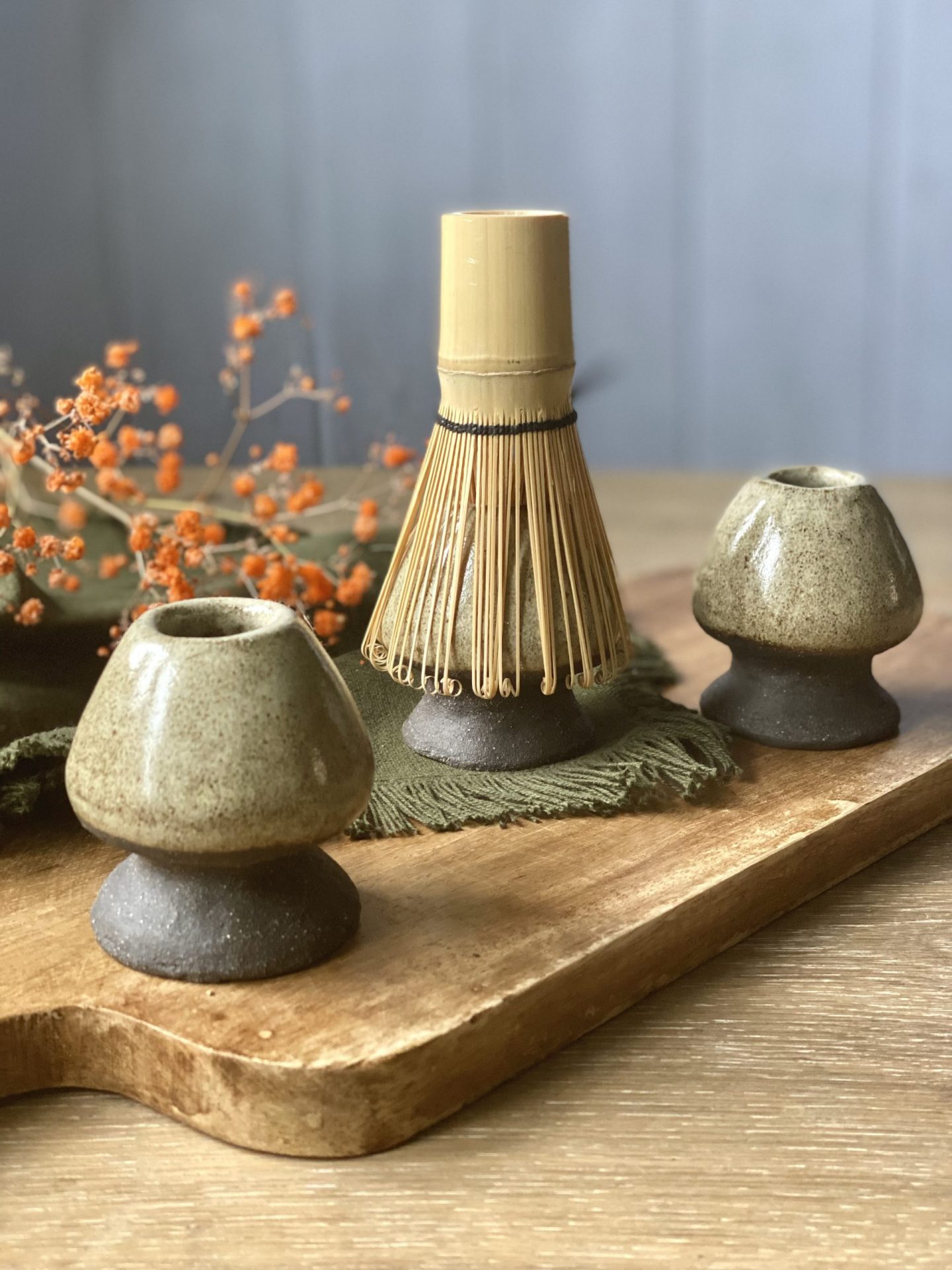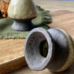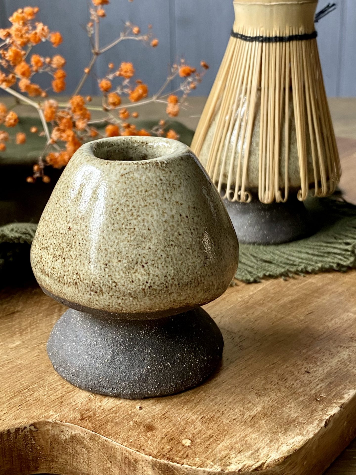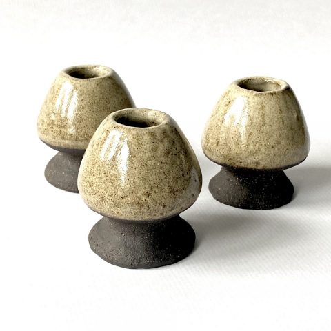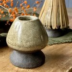 Le support à fouet matcha NORI en céramique artisanale est façonnée à la main en grès noir chamotté, recouvert d’un émail brillant crème pyrité. Matières premières naturelles, sans additif toxique. Convient à un usage alimentaire.