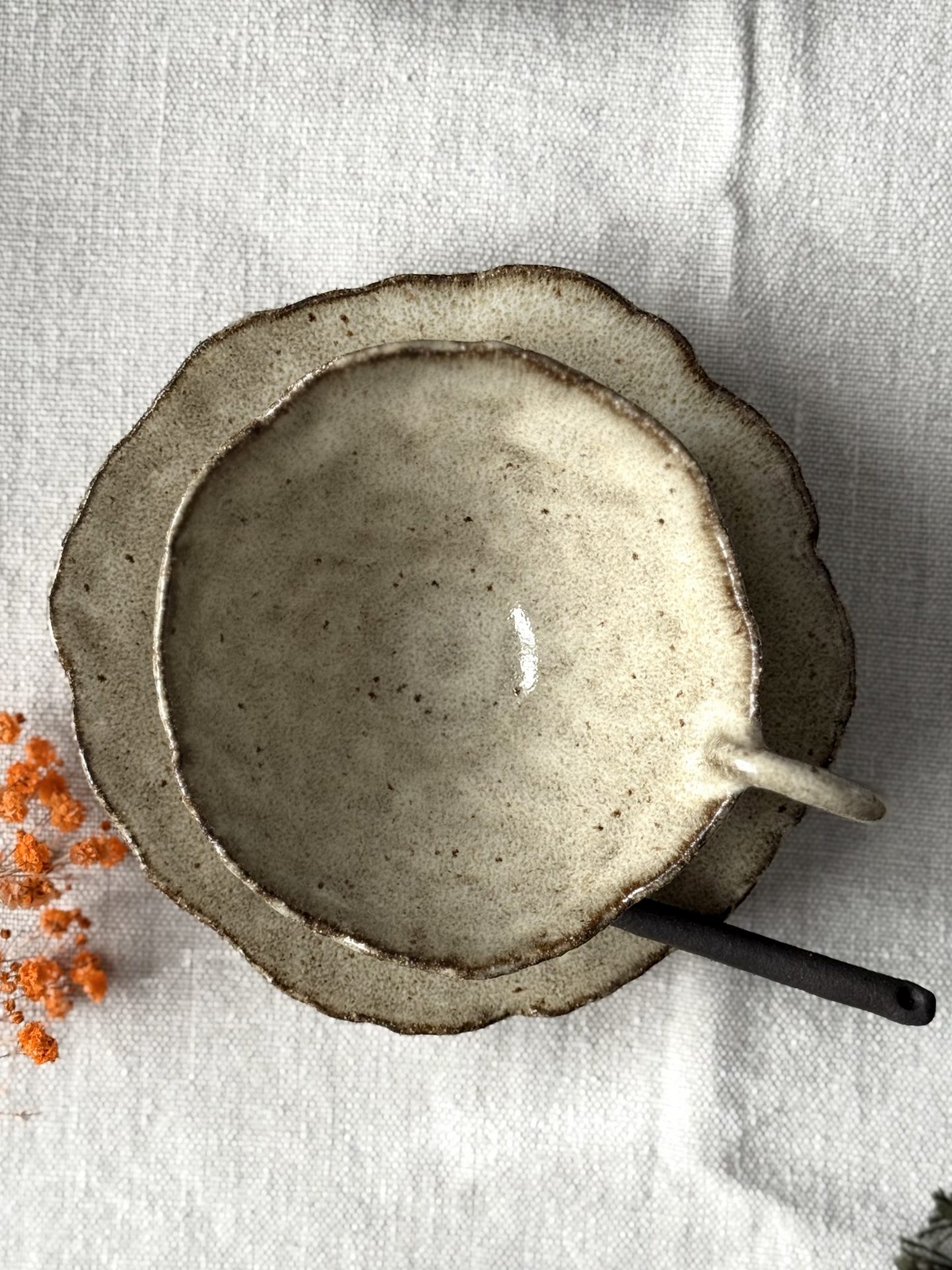 La tasse LILIUM en céramique artisanale est façonné en grès noir chamotté, elle est recouverte d’un émail brillant crème pyrité. Elle possède un pied sculpté, et son dessous est également émaillé, ce qui facilite l’entretien et apporte un confort supplémentaire à l’usage. Adapté à un usage alimentaire.