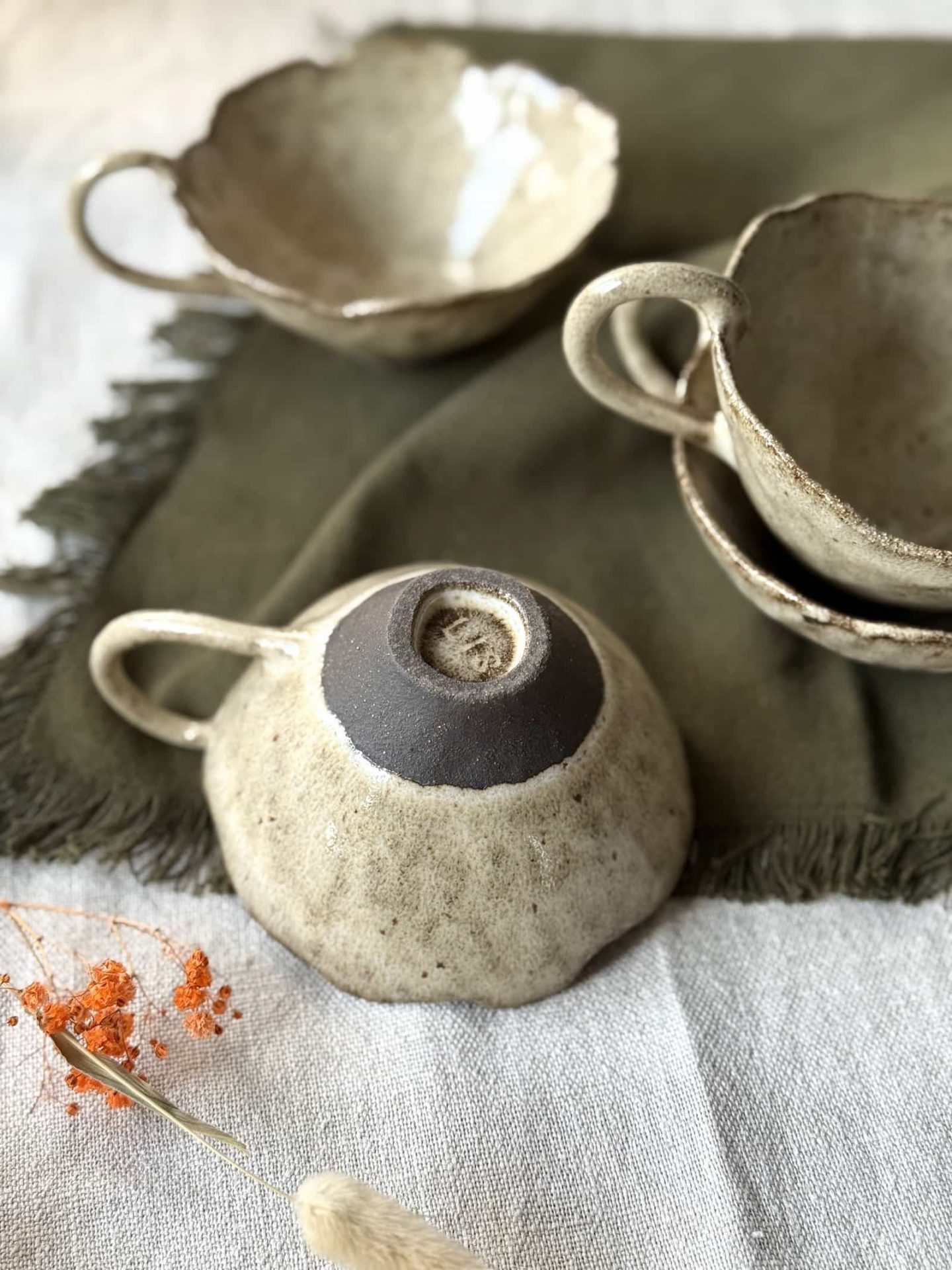 La tasse LILIUM en céramique artisanale est façonnée en grès noir chamotté à la main, sans tour, au pincé ou au colombin. Elle est recouverte d’un émail brillant crème pyrité. Elle possède un pied sculpté, et son dessous est également émaillé, ce qui facilite l’entretien et apporte un confort supplémentaire à l’usage. Adapté à un usage alimentaire. Chaque pièce est créée dans mon atelier en Haute-Savoie, France, en petites séries.
