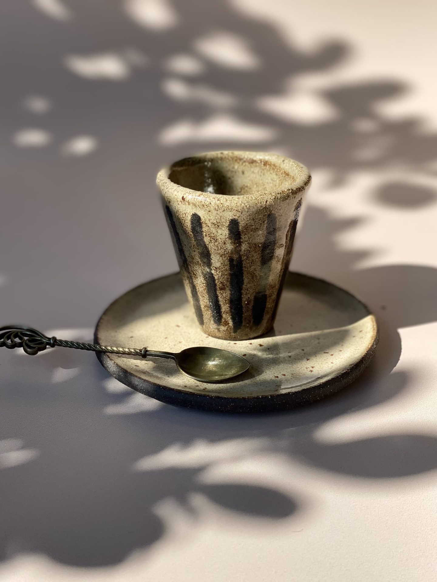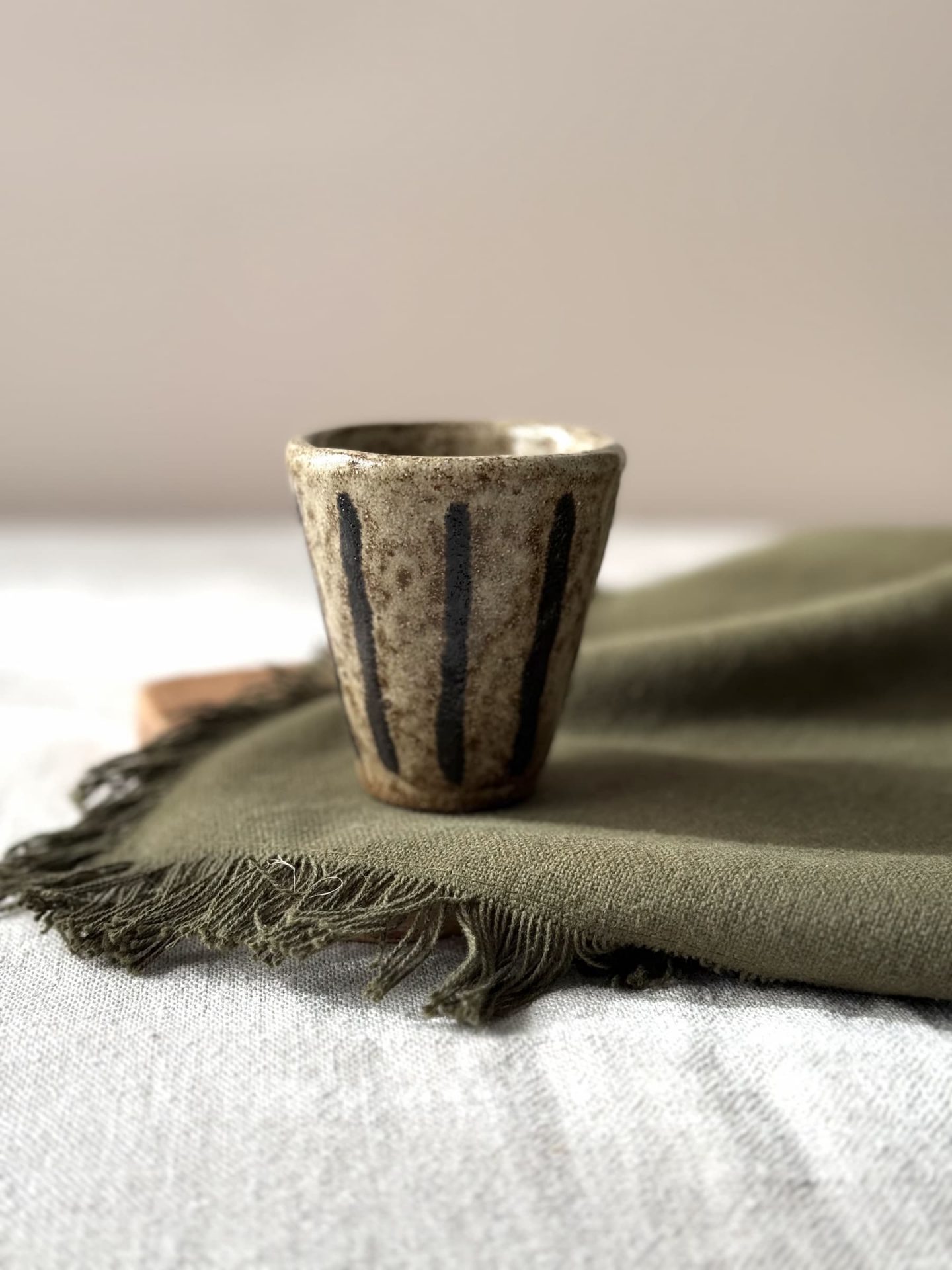 Elle est recouverte d’un émail crème brillant pyrité qui contraste avec la profondeur de la terre noire. À l’extérieur, de larges zébrures noires, épaisses et irrégulières, traversent la surface comme des traces brutes. Ces marques affirmées donnent à la tasse un aspect minéral, authentique et vivant.