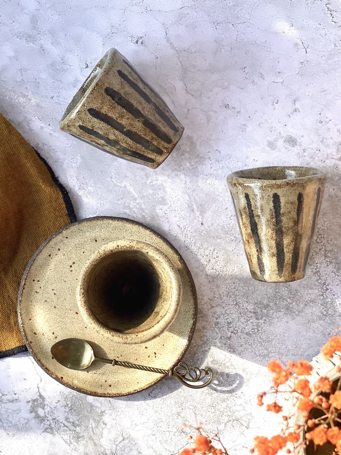 La tasse NAIA en céramique artisanale est façonnée à la main en grès noir chamotté et recouverte d’un émail crème brillant pyrité. Ses larges zébrures noires lui donnent un caractère brut et minéral.