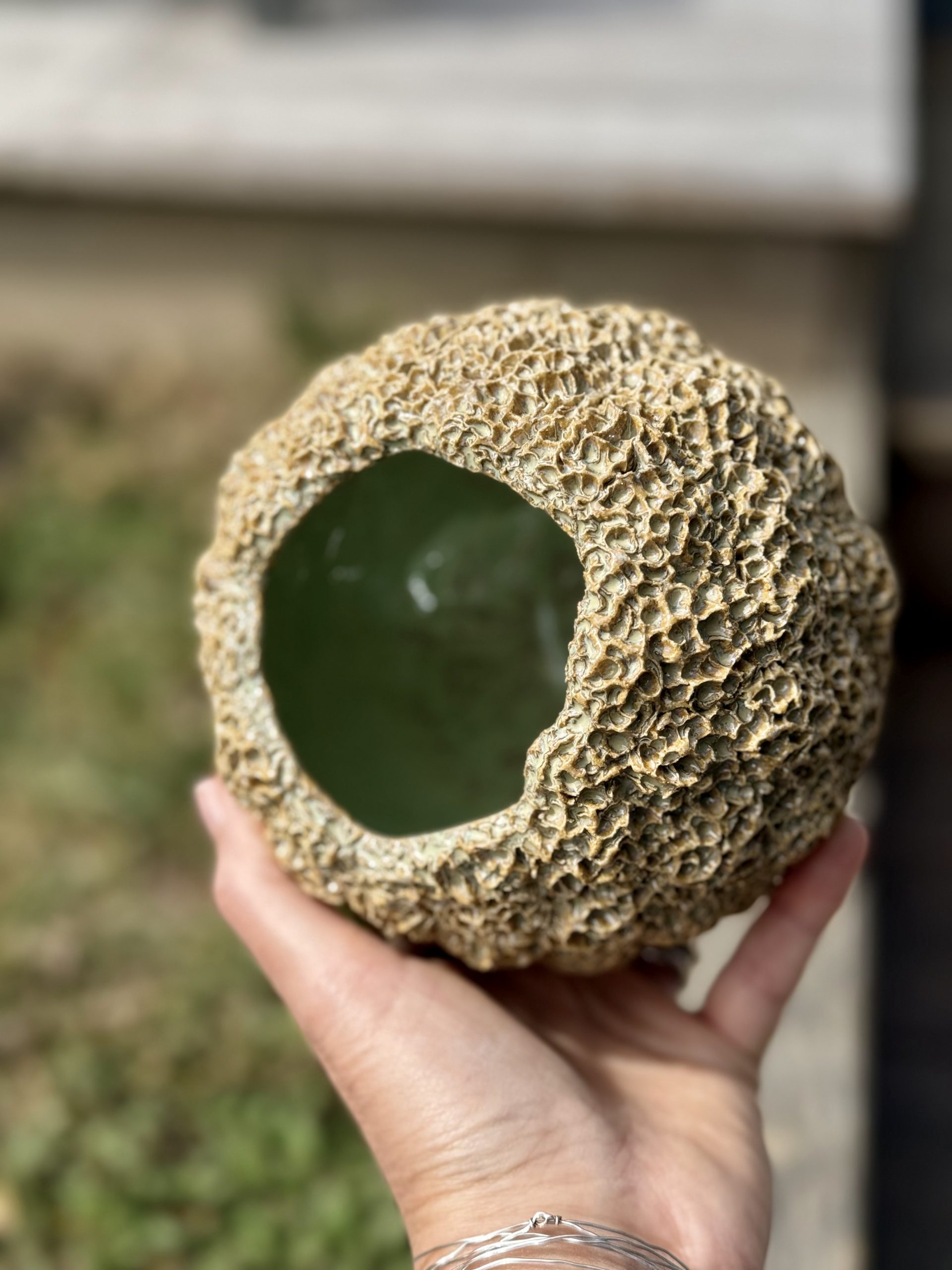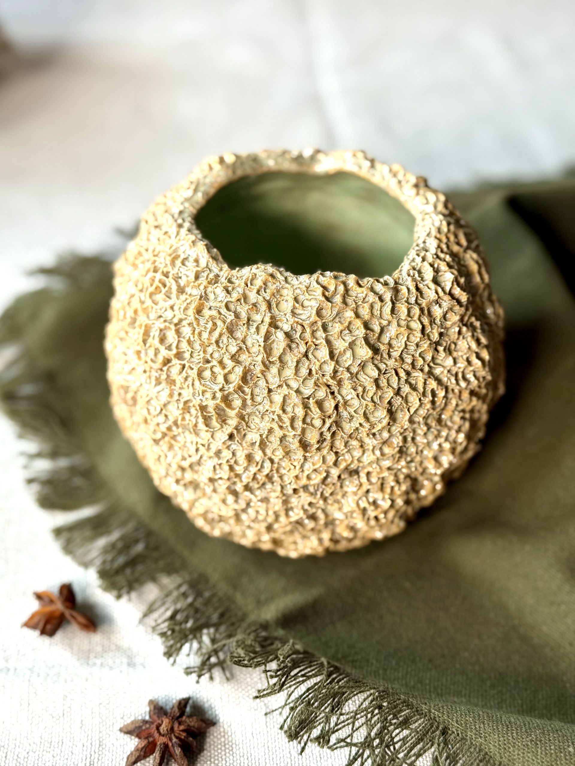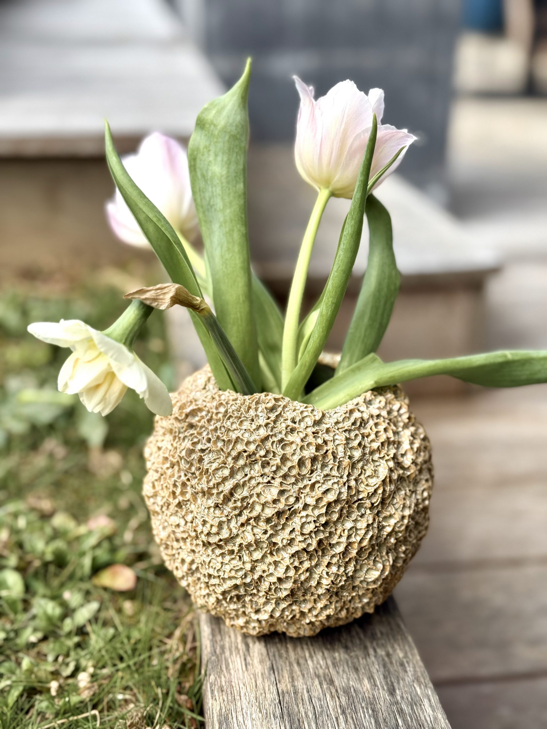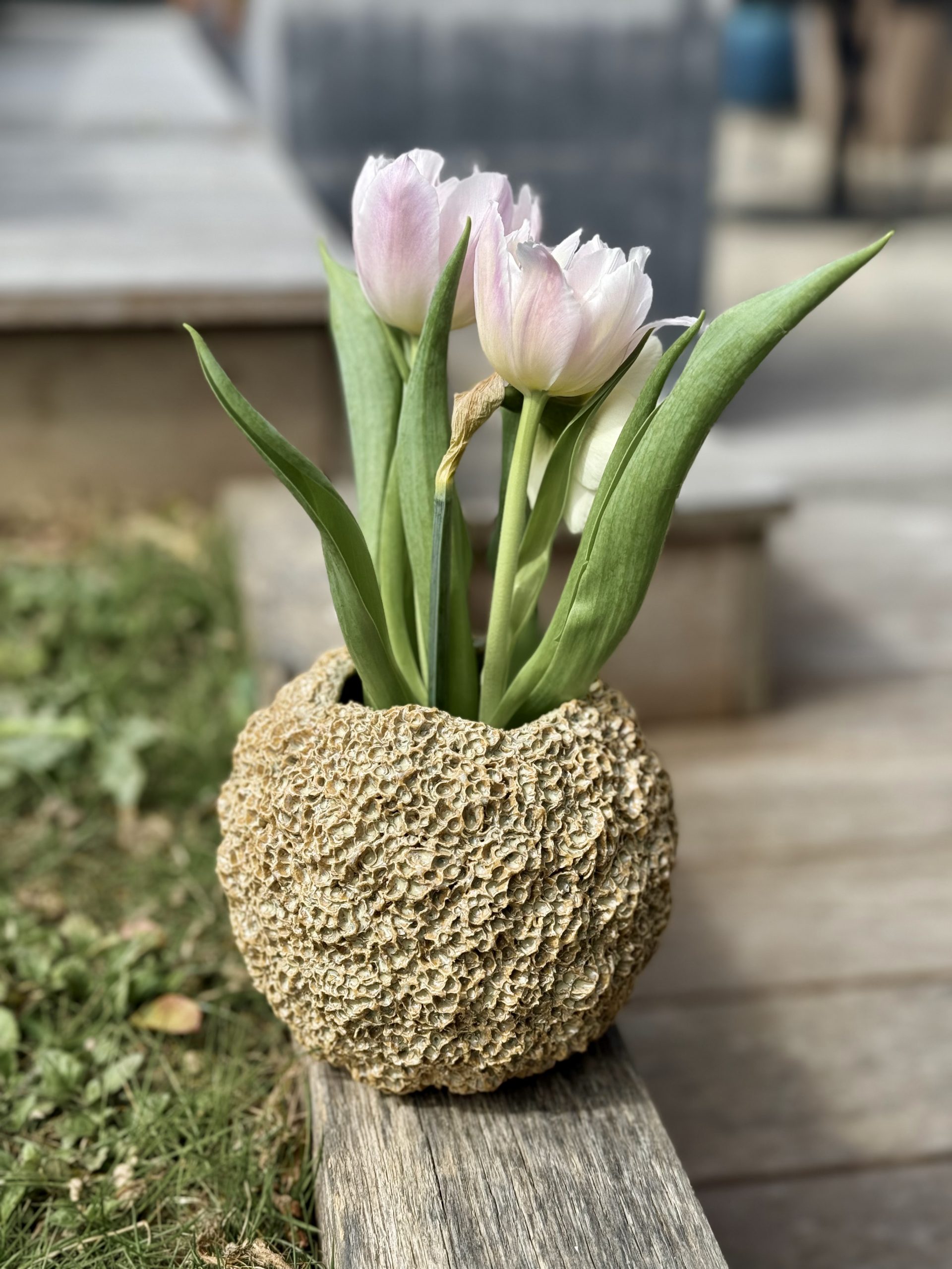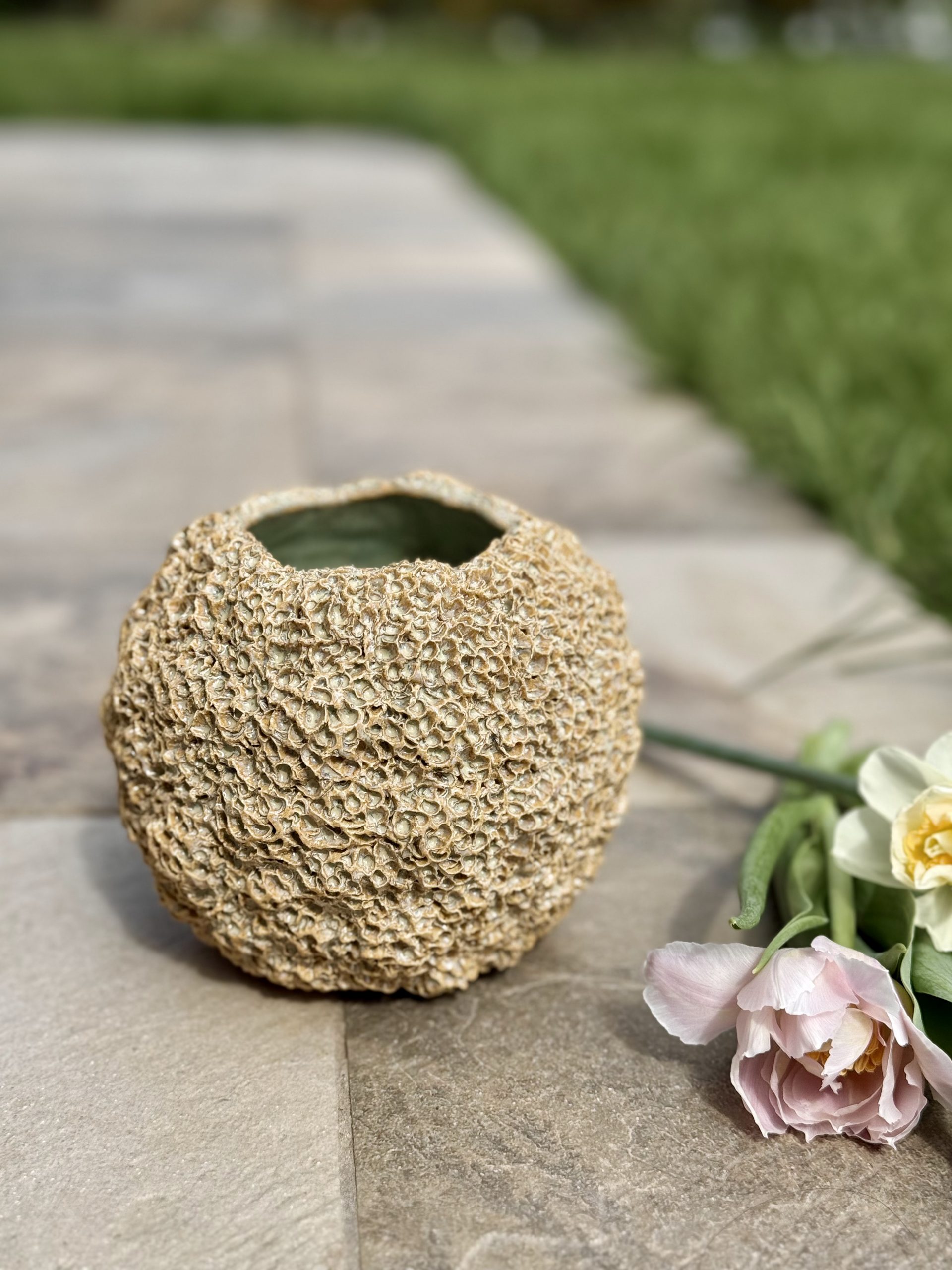 Le vase BORA est une pièce en céramique artisanale, façonnée à la main en grès blanc chamotté. Son extérieur texturé évoque les rochers sculptés par les vagues et rend chaque création unique et pleine de caractère.